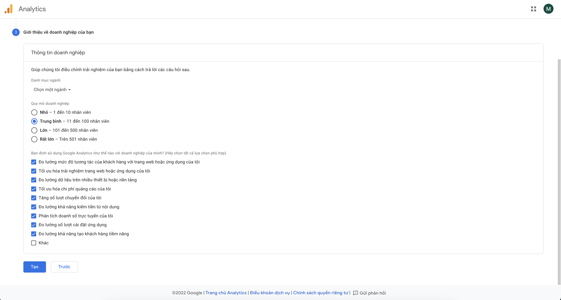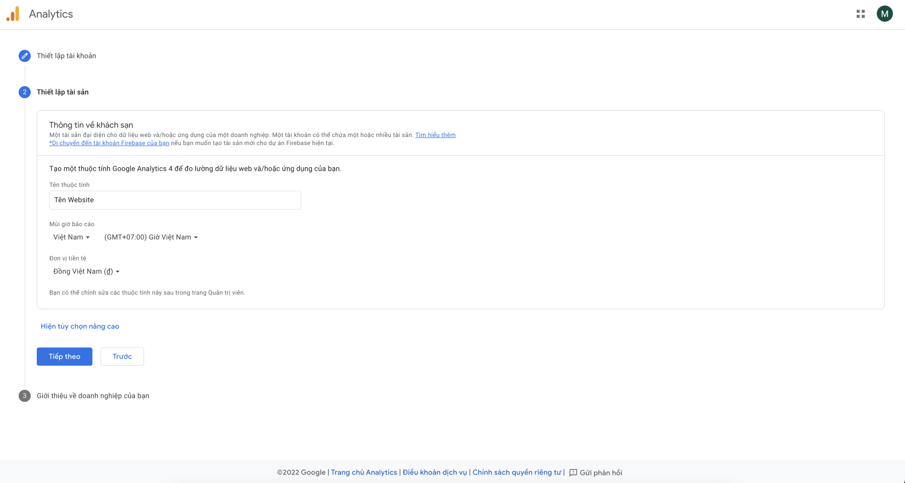 Điền thông tin về tài khoản của bạn, một tài khoản GA có thể tạo đến 40 mã theo dõi Website