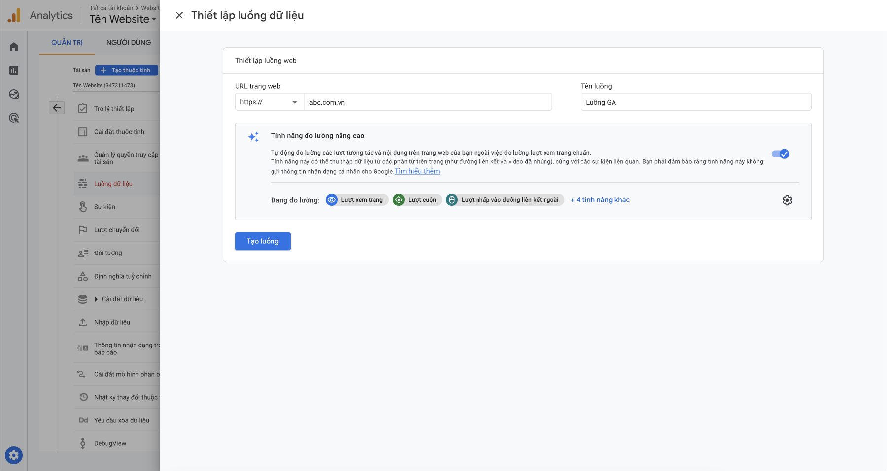 Sau khi chọn lưu sẽ là màn hình thiết lập luồng dữ liệu theo dõi website của bạn, tiến hành điền tên miền và tên luồng theo dõi website và chọn tạo luồng.