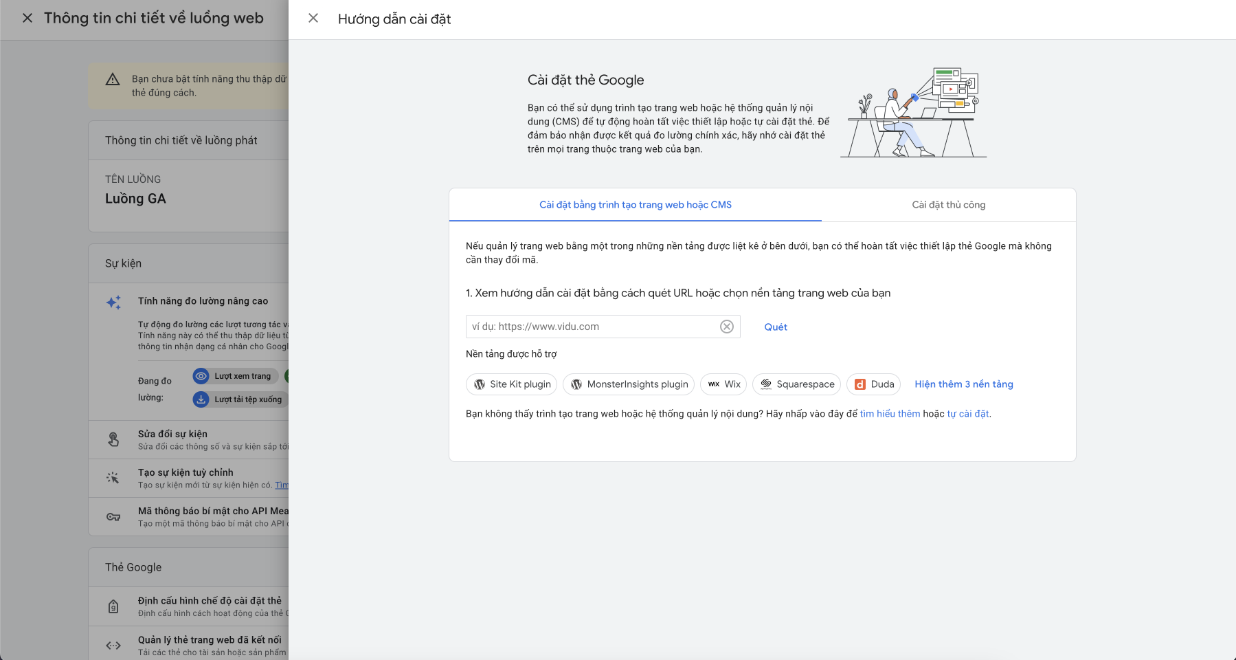 Sau khi tạo luồng màn hình hướng dẫn tích hợp xuất hiện chọn Cài đặt thủ công để được lấy mã theo dõi