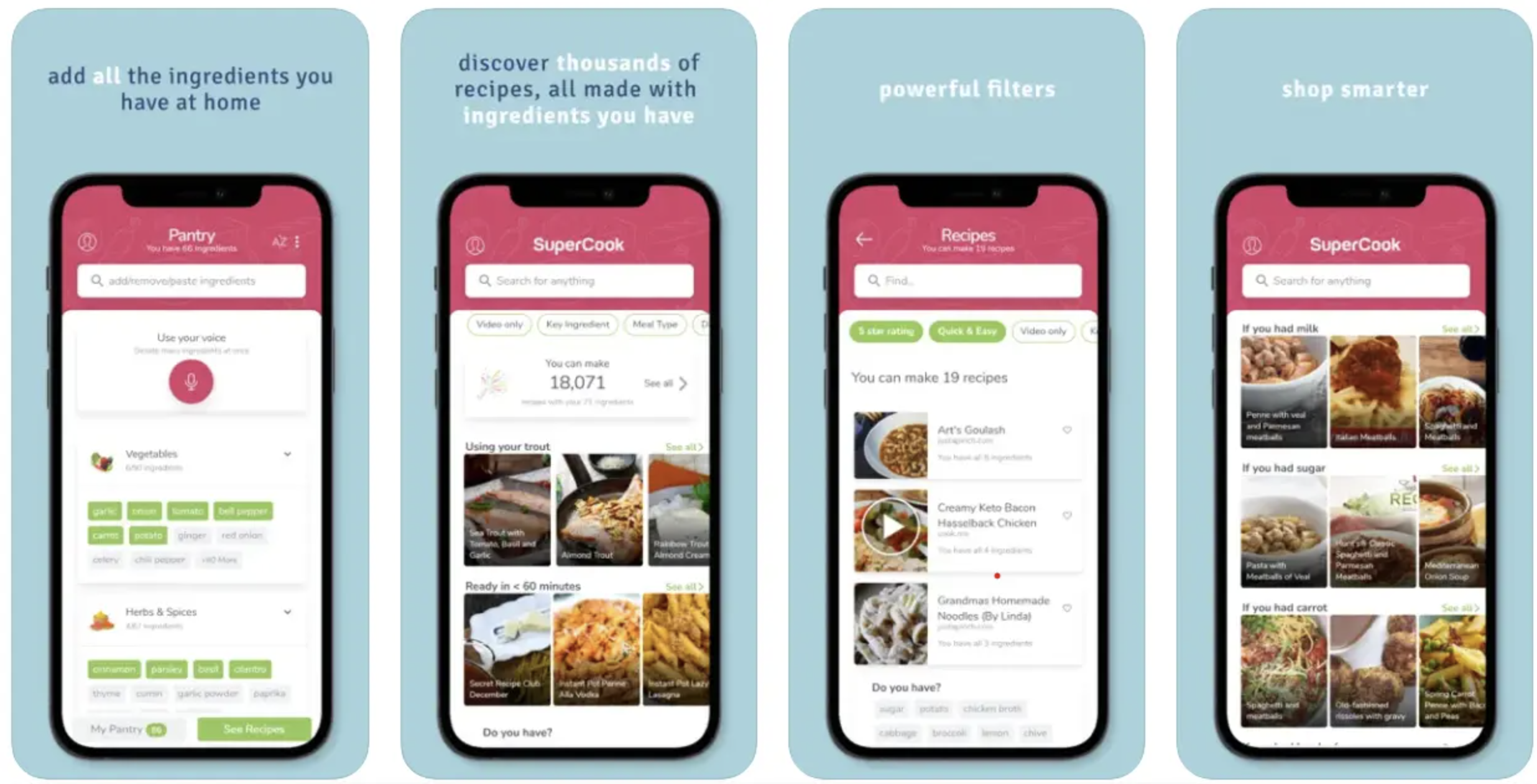 SuperCook giúp người dùng khám phá các công thức nấu ăn dựa trên các nguyên liệu có sẵn, giảm thiểu lãng phí thực phẩm. Ứng dụng đề xuất các công thức sử dụng các nguyên liệu cụ thể và thậm chí đề xuất thêm các nguyên liệu khác. Người dùng có thể lọc công thức theo loại bữa ăn, ẩm thực, chế độ dinh dưỡng và nhiều hơn nữa từ cơ sở dữ liệu chứa 11 triệu công thức. Với danh sách mua sắm tích hợp, tab công thức yêu thích và hơn 2000 nguyên liệu, SuperCook khuyến khích sự sáng tạo và không có quảng cáo, biến nó thành một công cụ quý giá và thân thiện với người dùng.