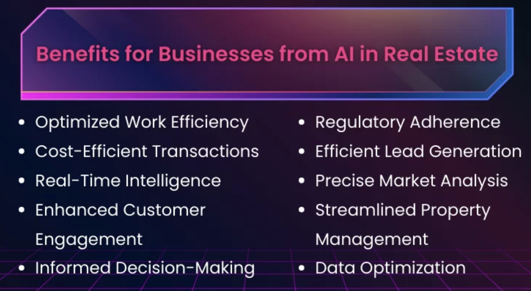 Những lợi ích đa chiều này làm nổi bật vai trò biến đổi của Trí tuệ Nhân tạo trong lĩnh vực bất động sản, mang lại nhiều cải tiến trên nhiều khía cạnh của ngành công nghiệp.