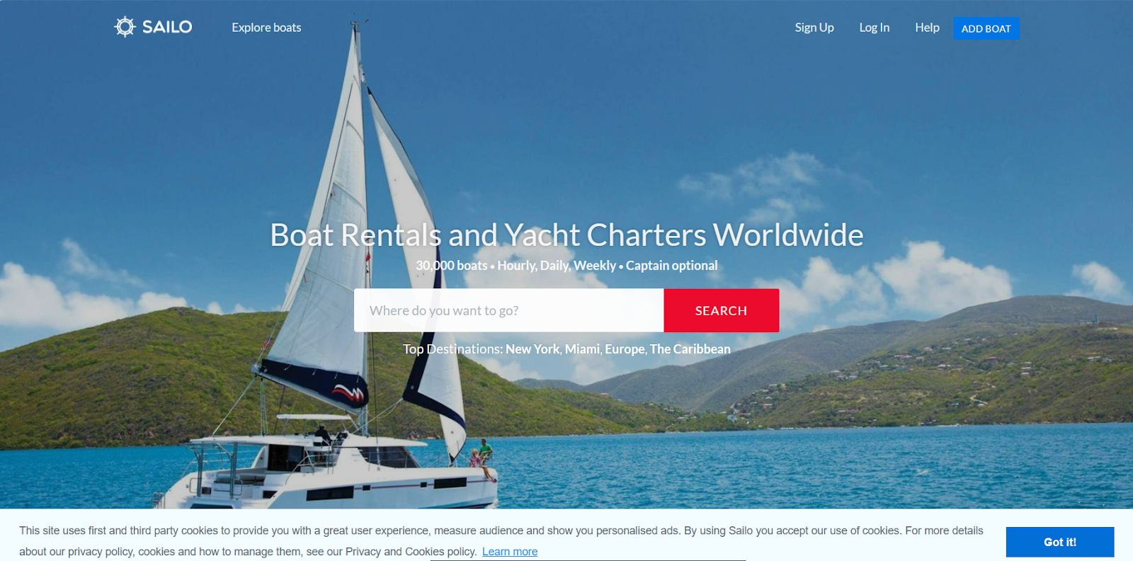 Sailo là trung tâm toàn cầu về cho thuê thuyền và cho thuê du thuyền, kết nối liền mạch giữa chủ thuyền, công ty cho thuê và người thuê thông qua một nền tảng an toàn và thân thiện với người dùng. Lựa chọn phong phú của Sailo bao gồm thuyền máy, thuyền buồm, siêu du thuyền sang trọng và thuyền hai thân, trải dài khắp ba châu lục, bao gồm hơn 50 quốc gia và đến 500 địa điểm đẹp như tranh vẽ trên toàn thế giới. Từ những điểm đến mang tính biểu tượng như New York, San Francisco và Miami đến những địa điểm kỳ lạ như Athens, Lisbon và Phuket, đội tàu của chúng tôi đi qua các khu vực du thuyền tuyệt đẹp nhất thế giới, chia sẻ cảm giác hồi hộp khi chèo thuyền với hàng nghìn người đam mê mỗi năm.